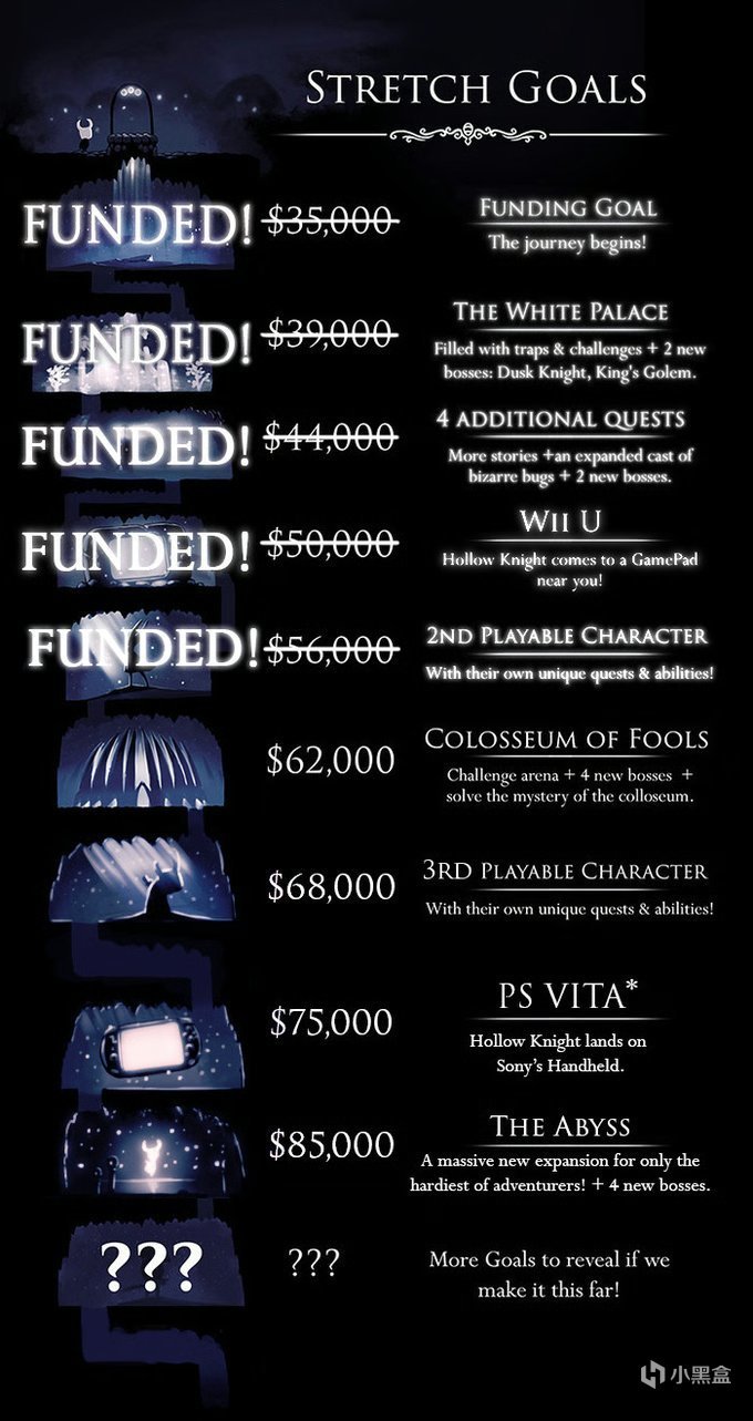 2014 年,Team Cherry 在 Kickstarter 上为《空洞骑士》发起众筹,当时设定了多个令人心动的拓展目标。其中,当众筹金额达到 5.6 万美元时,团队承诺将推出 “第二名可玩角色”,该角色拥有独立的任务线与独特能力;若金额攀升至 6.8 万美元,“第三名可玩角色” 也将加入游戏。虽然最终众筹金额定格在 5.7 万余美元,仅勉强突破了第二名可玩角色的目标,但这一设定却在玩家心中埋下了期待的种子。如今,随着《丝之歌》的成功发售,玩家们开始畅想那些未曾实现的众筹目标,究竟谁会成为下一个在圣巢或新的神秘世界中冒险的主角。