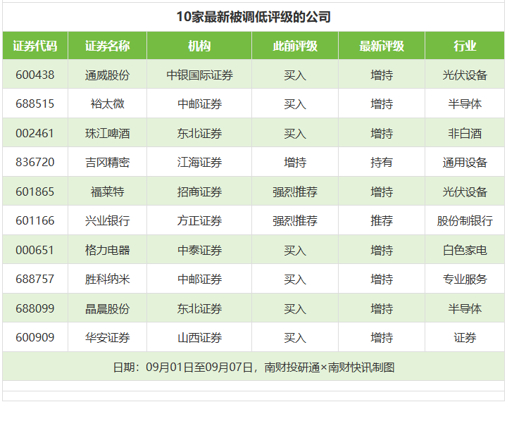 评级调低方面,9月1日至9月7日,券商调低上市公司评级达到22家次,最新数据包括了中银国际证券对通威股份的评级从“买入”调低至“增持”,中邮证券对裕太微的评级从“买入”调低至“增持”,东北证券对珠江啤酒的评级从“买入”调低至“增持”。
