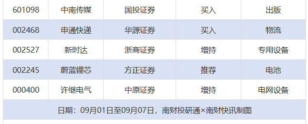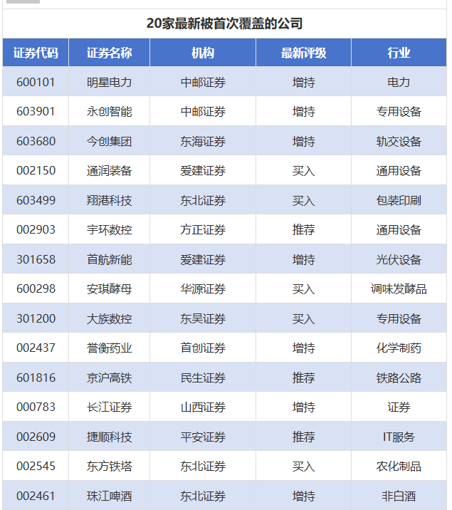 首次覆盖方面,9月1日至9月7日券商共给出了133次首次覆盖,其中明星电力、永创智能获得中邮证券分别给予“增持”“增持”评级,今创集团获得东海证券给予“增持”评级,通润装备获得爱建证券给予“买入”评级,翔港科技获得东北证券给予“买入”评级。