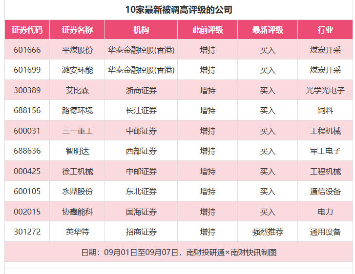 评级调高方面,9月1日至9月7日,券商调高上市公司评级达到27家次,最新数据包括了华泰金融控股(香港)对平煤股份的评级从“增持”调高至“买入”,华泰金融控股(香港)对潞安环能的评级从“增持”调高至“买入”,浙商证券对艾比森的评级从“增持”调高至“买入”。